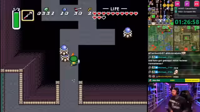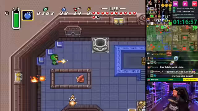 04:12:48Der Race beginnt offiziell, nachdem der Streamer den Raceroom geöffnet und die notwendigen Einstellungen im Zelda Randomizer vorgenommen hat. Mit einer Teilnehmerzahl von zehn Spielern startet das Rennen im 'Casual Boots Modus'. Der Streamer sammelt die ersten Items, muss jedoch feststellen, dass der Seed ungewöhnlich schwierig ist und bereits frühzeitig zu langen Wartezeiten im Dungeon Ice Palace führt.