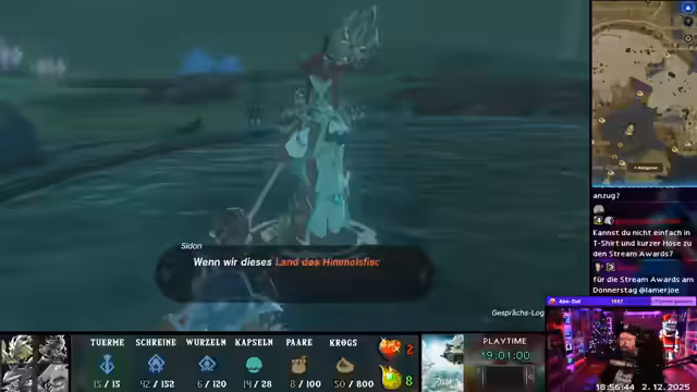 03:04:09Im Kristallwasserpalast wird der Streamer von König Dorefan empfangen. Hier erfährt er eine schockierende Information: Prinzessin Zelda wurde nach dem Ereignis am Schloss Hyrule gesehen, wie sie ein Monster aus Schlamm befehligte, das die Zoras angriff. Dies veranlasste den König, sich im Palast zu verstecken, um Hyrule vor Chaos zu bewahren. Die Geschichte rund um Zelda wird als Mysterium bezeichnet, dessen Lösung im Himmel liegen könnte.