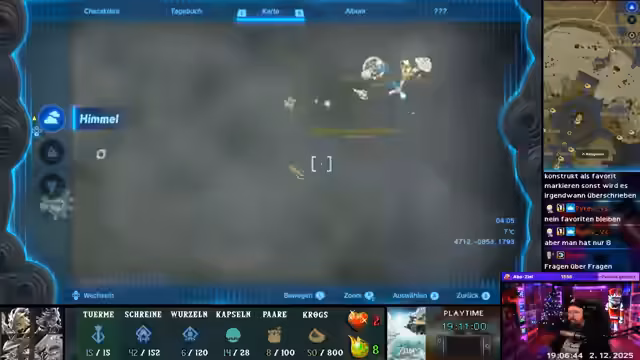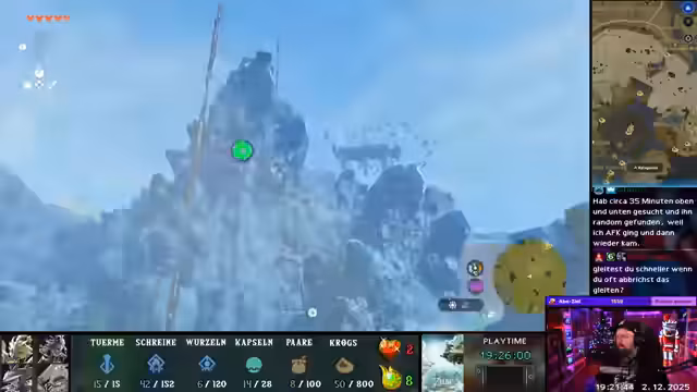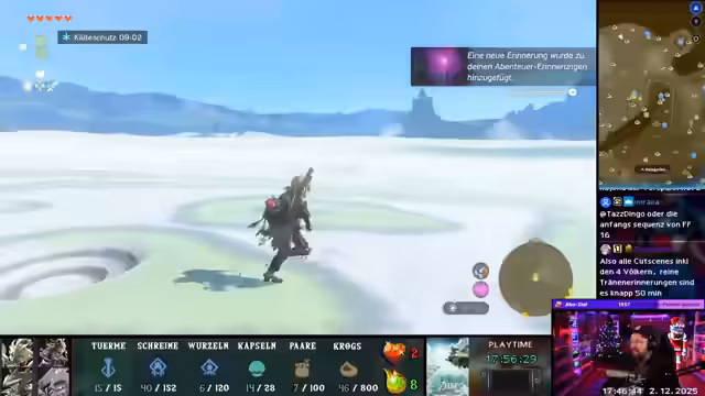 01:20:24Nach dem Gamestart konzentriert sich der Streamer auf den Fortschritt im Spiel. Er erkundet die Gegend, sammelt Ressourcen wie Eisexalfos-Hörner und frisches Fleisch, um seine Waffen und Rüstung zu verbessern. Unterwegs trifft er auf Schreine, die er freischaltet und deren Rätsel löst. Es gibt auch wiederkehrende Gegner wie Prustentiere und Bimbobs, die bekämpft werden müssen. Ein bemerkenswertes Element ist die Entdeckung eines verborgenen Schreins in einem eiskalten Gebiet, den er mit Hilfe eines Schilds als improvisierter Heizung erreicht.