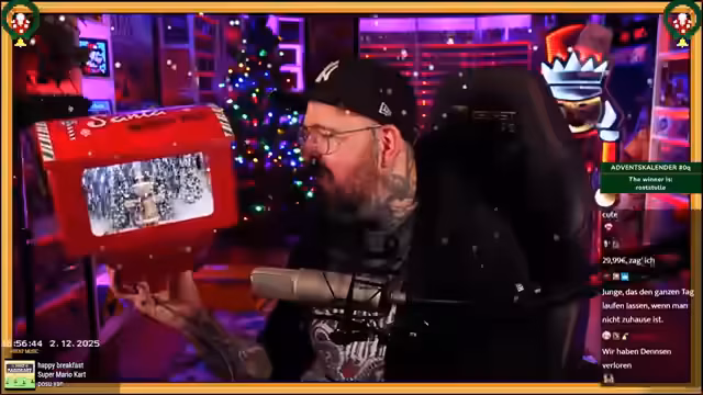 00:59:56Der Stream führt einen täglichen Adventskalender ein, der als interaktives Element für die Zuschauer dient. An diesem Tag wird Türchen 2 geöffnet, was den Start eines Giveaways markiert. Der Streamer präsentiert die zu verlosenden Preise, darunter eine spezielle Edition von The Legend of Zelda: A Link to the Past Randomizer. Nach einer lebhaften Interaktion im Chat, bei der Spoiler ausgeplaudert werden, wird der Gewinner gezogen und erhält die Titel als persönliche Glückwünsche.