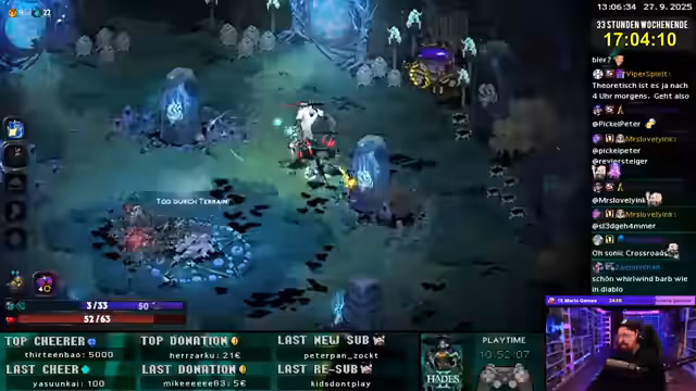 03:13:23Der finale Hades Run wird mit einem auf den Spezialangriff optimierten Build gestartet. Der Streamer ignoriert normale Angriffe und konzentriert sich komplett auf die Nutzung der Omega-Fähigkeit. Dadurch wird der Charakter extrem agil und verursacht enormen Schaden. Obwohl der Start des Runs etwas holprig ist, funktioniert der Plan letztendlich erfolgreich und demonstriert die Macht eines gut optimierten Builds in Hades.