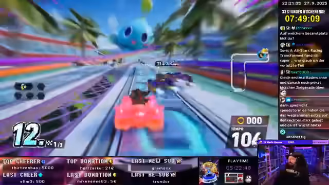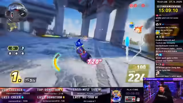 09:15:33Nach dem Wechsel zu Sonic Racing Crossworlds beginnt der Streamer sein Training. Er konzentriert sich zunächst auf das Time-Trial-Modus, um die Strecken und optimale Linien zu erlernen. Er probiert verschiedene Charaktere und Fahrzeuge aus, wie den 'Dark Reaper', und versucht, die von ihm als 'kacke' empfundenen Items zu umgehen. Gleichzeitig testet er die Lautstärke und den Allgemeinzustand seines Setups, um für das bevorstehende Turnier bereit zu sein, und stellt sein Setup auf das Overlay von 1996 um.