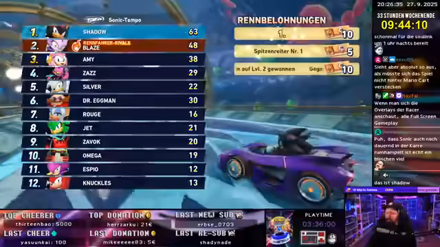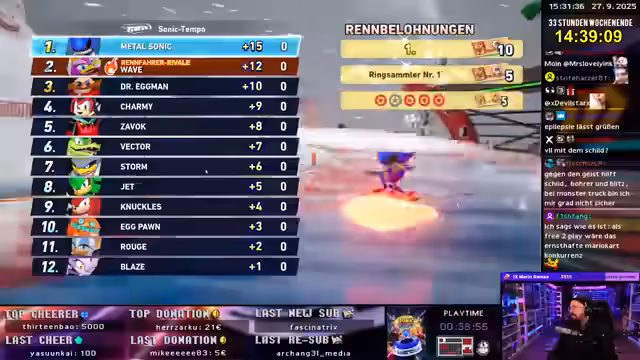 12:33:06Nach dem Ende des Sonic Speed Rivals-Turniers resümiert der Streamer das Wochenende. Trotz des mäßigen Abschneidens im Wettkerbewerb hebt er den generellen Spielspaß positiv hervor. Er bedankt sich bei der Community für den Support und kündigt für den nächsten Tag, Sonntag um 12 Uhr, einen normalen Stream mit Pokémon Nutslog an. Gemeinsam mit Dingo will er das Event erfolgreich abschließen und die Zuschauer zu einem weiteren Stream einladen.