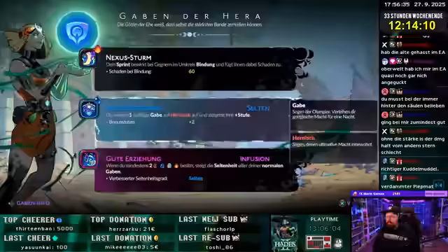 02:31:11Nachdem das letzte Gebiet in Grandia 2 abgeschlossen wurde, wechselt der Streamer zum Spiel Hades. Der bisherige Run in Hades gestaltet sich ungewöhnlich einfach, was der Streamer mit den starken Upgrades und Boons in der Oberwelt erklärt. Durch das Beschenken von Gottheiten und das Nutzen spezifischer Builds, die auf das Töten von Gegnern ausgerichtet sind, wird der Charakter so mächtig, dass selbst Bosse schnell besiegt werden.