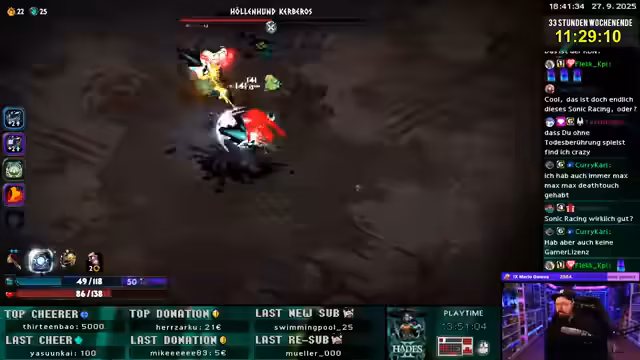 03:02:18In Hades konzentriert sich der Streamer darauf, seinen Build weiter zu optimieren. Der Fokus liegt darauf, den Spezialangriff durch passives Mana zu regenerieren und so den Einsatz der Omega-Fähigkeit zu maximieren. Dabei werden Boons wie 'Kettenblitz' von Zeus und 'Bindung' genutzt, um massiven Flächenschaden zu verursachen. Das Ziel ist ein Build, der ausschließlich auf den Spezialangriff setzt und dadurch extrem hohe Schadenswerte erreicht.