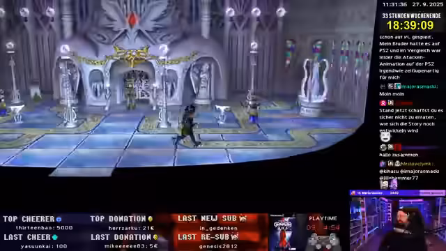 00:19:26Nach dem technischen Teil und der Ankündigung für den Abend startet der Stream ins Gameplay von Grandia 2. Die Gruppe um Ryudo reist in die Sandy Mountains und schlägt dort ein Lager auf. Nach einem Gespräch mit Aira und Milenia und einer Verwirrung bei der NPC-Interaktion, die sich je nach Klick-Reihenfolge anders darstellt, geht die Reise weiter. Nach einem Kampf gegen Yetis erreichen die Helden endlich das Ziel ihrer Reise: die Granas-Kathedrale. Dort angekommen, treffen sie auf Schwester Elena, die sie zum Papst weiterleiten will.