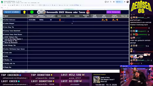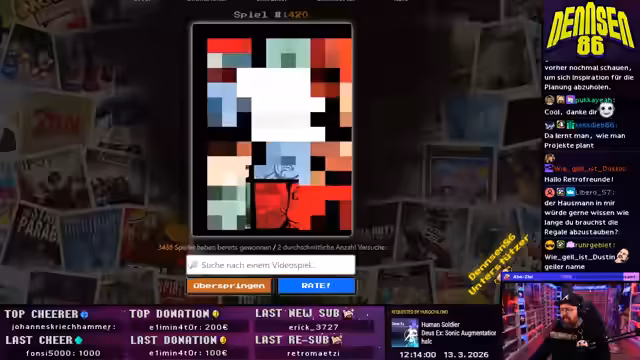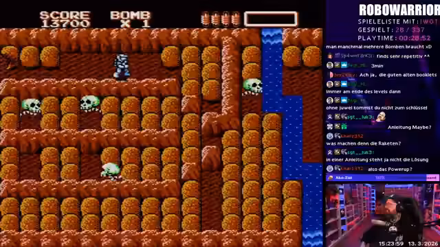 03:02:56Als nächstes wird ein zufälliges NES-Spiel ausgewählt: Robo Warrior. Das Spiel erinnert stark an Bomberman, mit dem Ziel, durch das Level zu navigieren und Juwelen zu finden. Die Mechanik ist jedoch unklar und führt zu Frustration, da keine Erklärungen vorhanden sind. Der Streamer kämpft mit Softlocks, bei denen er in Ecken feststeckt, und das Spiel endet abrupt nach 48 Minuten mit einer durchschnittlichen Bewertung von 6,6 aus dem Chat.