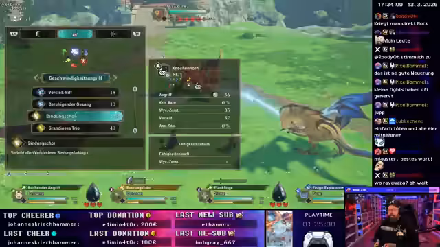 04:00:59Nach den Retro-Spielen wechselt der Streamer zum Hauptspiel des Tages: Monster Hunter Stories 3. Er erstellt seinen Charakter 'Densen', einen männlichen Ranger, und beginnt mit der Einführungsmission im 'Seuchensteinwald'. Das Spiel stellt ein rundenbasiertes Kampfsystem mit drei Angriffstypen vor: Kraft, Technik und Geschwindigkeit. Eine erste Konfrontation mit einem Velociprey wird erfolgreich abgeschlossen, um die Grundlagen zu demonstrieren.