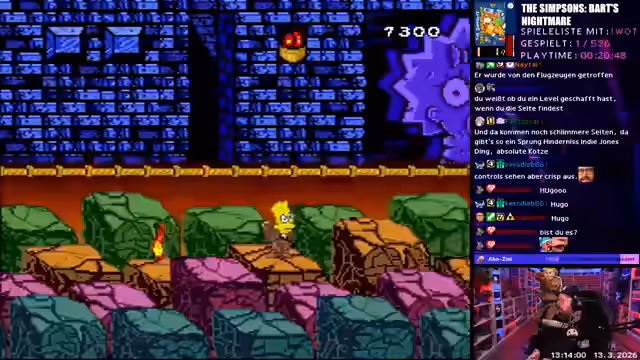00:57:31Die Hauptaktion des Streams beginnt mit 'Wonne oder Tonne'. Ein Vote startet, bei dem die Community das nächste System auswählt. Der Streamer zieht 'NES' als Gewinner. Als erstes Spiel wird 'The Simpsons Bards Nightmare' geladen. Der Streamer gestaltet den Stream mit vielen persönlichen Kommentaren, auch zu animierten Serien wie 'The Simpsons' und South Park, die er als nicht sein bezeichnet, und spielt das Spiel, obwohl er es seit seiner Kindheit nicht mehr gespielt hat.