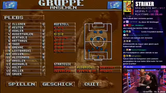 01:47:20Nachdem das erste Spiel mit einer Bewertung von 3,9 endet, wird ein neues Spiel gezogen: 'Striker'. Der Streamer zeigt sich begeistert von der Musik und den Optionen,Teams zu benennen. Allerdings stellt er schnell fest, dass es sich um ein PAL-Only-Spiel handelt und die Grafikfehler aufweist. Nach mehreren Versuchen und dem Bemühen, das Problem zu beheben, gibt er das Spiel auf und zieht ein drittes Spiel, um den Stream fortzusetzen.