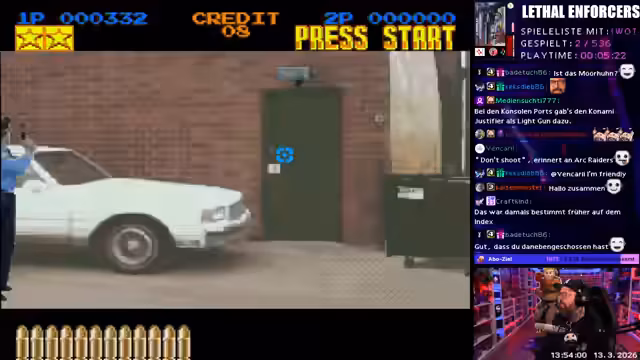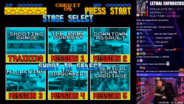 01:58:22Als drittes Spiel wird 'Lethal Enforcers' gezogen. Der Streamer erkennt es sofort als Lightgun-Shooter aus dem Arcadecabinet. Obwohl er keinen Lightgun hat, spielt er es erfolgreich mit dem Controller im Training. Er ist von der Darstellung und der Inszenierung der Missionen beeindruckt, findet das Gameplay aber recht einfach und repetitiv. Die Mission 'Bank Robbery' stellt das Spiel als technisch beeindruckend dar, auch wenn die Grafik nicht state-of-the-art ist.