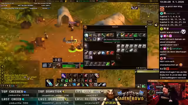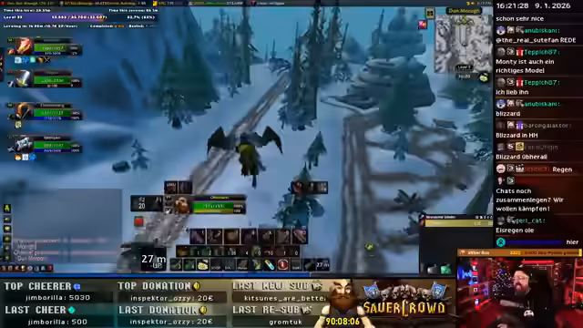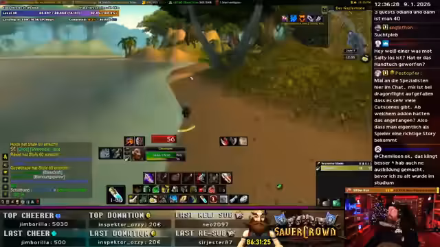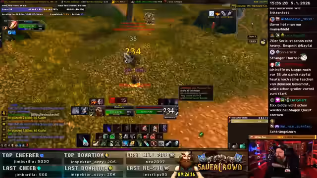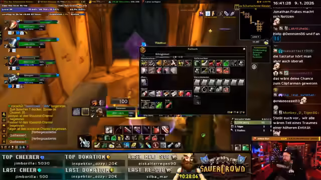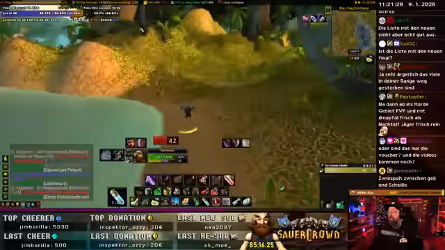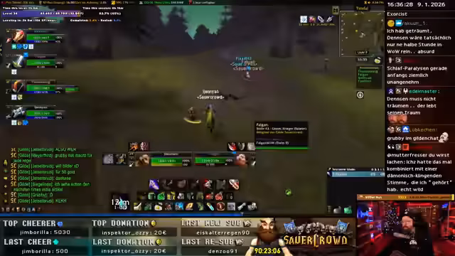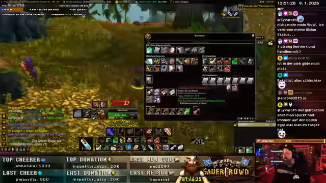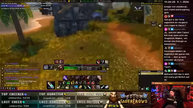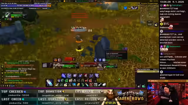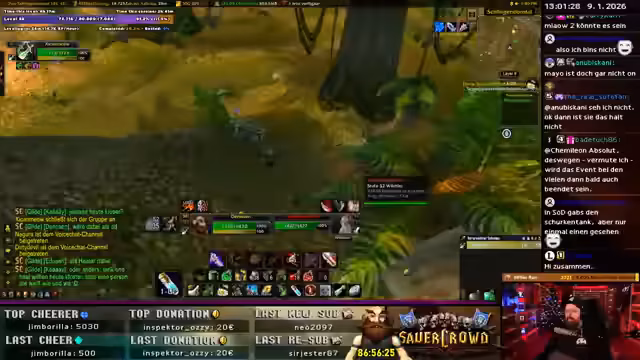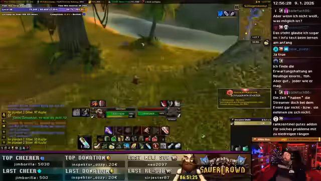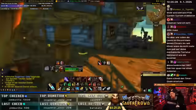 00:00:00Der Stream beginnt mit einem Adrenalinschub, als der Streamer knapp einem vorbeifahrenden Fahrzeug entgeht und von seiner Herzrasen berichtet. Im World of Warcraft Gameplay erlebt er diverse kritische Momente, darunter einen fast tödlichen Sturz und einen Game-Fehler, der seinen Charakter gefangen hält. Ein humorvoller Vorfall ereignet sich, als er versehentlich ein Trennungsritual vollzieht, bevor er sich der Beziehung wieder widmet. Die Stimmung wechselt zwischen Aufregung über erhaltene Items und Frustration über lahmende Krokodile und die unübersichtliche Benutzeroberfläche des Spiels.