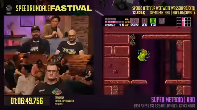 06:46:32Beim Kampf gegen Mother Brain setzt der Streamer den Plasma Beam ein und beginnt den finalen 'Escape-Part'. Nachdem er die Bossin mit einem speziellen Trick und Hilfe eines Metroid besiegt hat, nutzt er einen weiteren Moonfall, um schnell zum Ausgangspunkt zurückzukehren. Die Flucht aus der Basis gelingt ihm ohne Probleme und er erreicht das Schiff, wodurch der Run nach einer Stunde und 21 Minuten beendet ist. Dies wird als ein 'astraler Run' ohne größere Fehler bezeichnet, bei dem eine exzellente Zeit erreicht wurde.