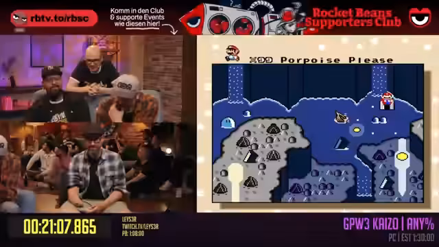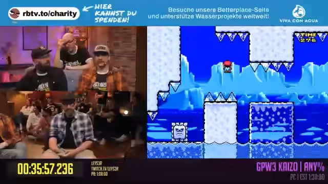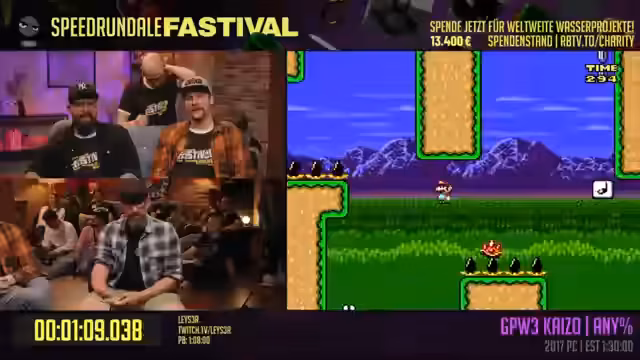 07:14:15Der Stream shiftet zu einem Höhepunkt des Tages: dem Grand Pool World 3 Kaizo-Mario-Hack. Der Speedrunner Laser, der wegen einer fehlenden Hand mit einem speziell angepassten Controller spielt, beginnt den Run. Besondere Aufmerksamkeit gilt dem angekündigten Bosskampf, der später auf einer Tanzmatte stattfinden soll. Trotz des anfänglichen Todes und der ungewohnten Umgebung gelingt es Laser, souverän durch die ersten, anspruchsvollen Level zu navigieren und beeindruckt mit seinen Skills.