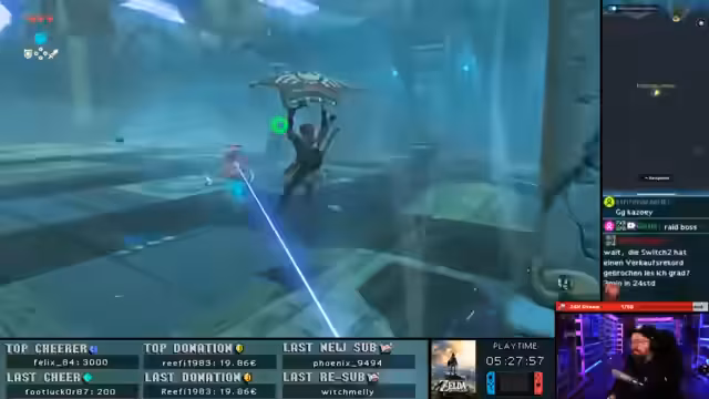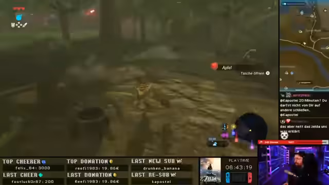 02:13:31Der Streamer entdeckt neue Gebiete und sammelt weitere Ressourcen wie Pfeile und Metallkisten. Er unterhält sich über verschiedene Spiele wie The Goonies und zeigt Begeisterung für Breath of the Wild. Er erwähnt auch eine mögliche Kooperation mit dem Chat für bestimmte Rätsel wie 'Rookshot Flöte Mirror'. Während des Streams zeigt er Engagement und Interaktion mit den Zuschauern, indem er auf Fragen reagiert und Entscheidungen im Spiel mit ihnen diskutiert.
