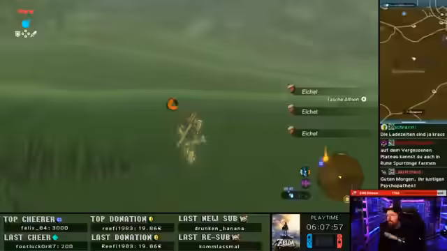 07:47:26Der Streamer erkundet die antiken Teile von Zelda: Breath of the Wild und experimentiert mit einer Reiseburg, die erhöhte Haltbarkeit bietet. Er zeigt Begeisterung für die Steuerung und das Drehen von Elementen im Spiel. Der Streamer sammelt Ausdauer und erkundet Hyrule, wobei er besondere Aufmerksamkeit auf Spurtechsen beim Mähen lenkt. Er plant, später Secret Lair-Produkte zu erwerben und zeigt Begeisterung für die Switch 2. Die Session endet mit der Ankündigung weiterer Zelda-Sessions in der Zukunft.