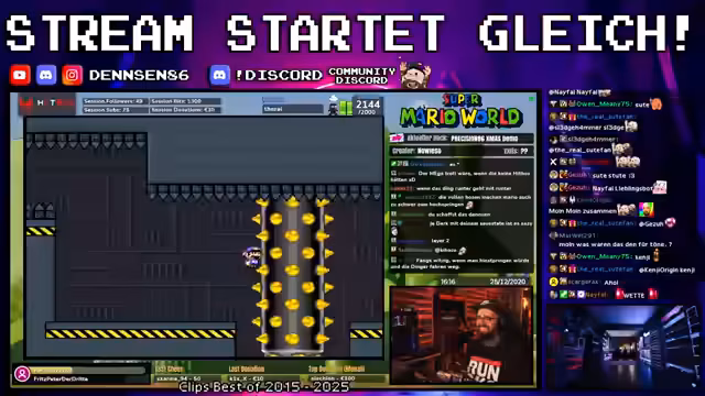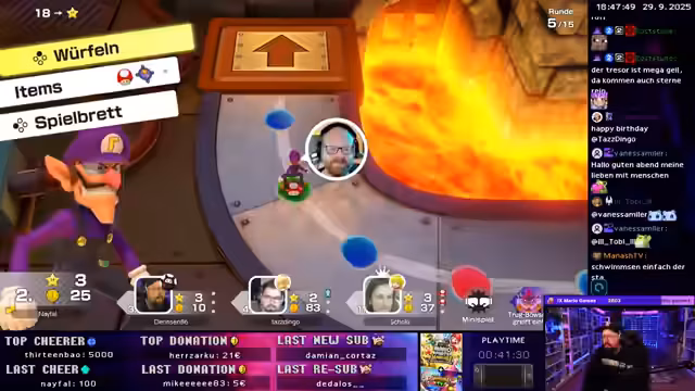 03:29:27Der Stream beginnt mit einer intensiven Mario Party Runde, die von hohem Tempo und strategischen Entscheidungen geprägt ist. Spieler navigieren durch ein komplexes Spielfeld, kämpfen um Sterne und müssen dabei zufällige Ereignisse wie Bowser-Felder und Minispiele meistern. Kommentare zur Spielsituation zeigen ein hohes Engagement und gleichzeitig Frustration über unfaire Zufallselemente. Besonders die Gefahr, durch Bomben oder Bowser-Felder Sterne zu verlieren, sorgt für ständige Spannung und Tempowechsel.