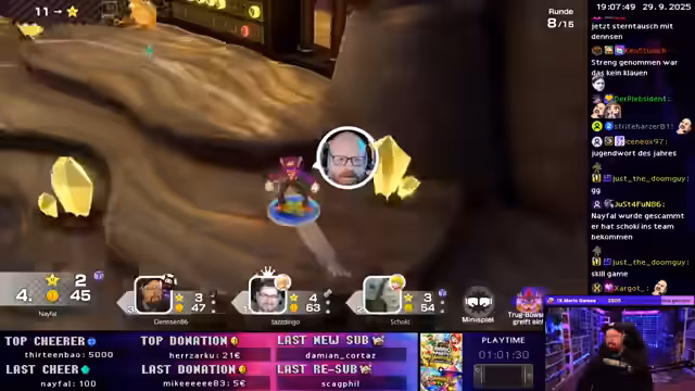 02:21:20Mario Party Jamboree startet mit 38 Sternen für Geburtstagskind Dingo als Startvorteil. Die Diskussionen drehen sich um die Spielfigurenwahl, wobei Rosalina als uninteressantster Charakter angesehen wird. Das Spiel selbst gestaltet sich chaotisch, mit zufälligen Ereignissen wie Bowser-Feldern, die das Spielfeld verändern, und Minispielen. Schoki wird durch einen Glücksfeld-Effekt mit drei Items beliefert, während Dingo trotz seines Geburtstagsvorteils Schwierigkeiten hat, zu punkten. Die Kommunikation im Chat ist unkoordiniert, was zu Fehlern führt.