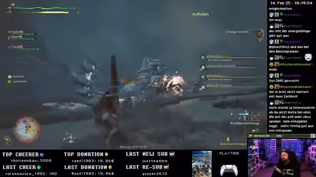 03:56:17Der Streamer diskutiert die Schwierigkeiten beim Kampf gegen grösse Monster im Solo-Spielmodus. Er stellt fest, dass der Bogen zwar effektiv ist, aber auch gefährlich sein kann. Er erwähnt, dass das Spiel wahrscheinlich im Multiplayer-Modus viel einfacher ist, besonders mit Absprachen im Voice-Chat und koordinierten Angriffen.