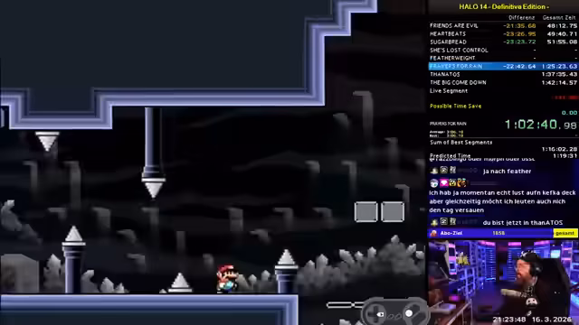 00:00:00Der Streamer startet seine Speedrun-Session mit dem Halo 14: Definitive Edition Hack für Super Mario World. Er ist hochmotiviert und präsentiert den Kombinations-Hack, der aus zwei verschiedenen Hacks besteht und 23 Exits bietet. Obwohl es sich um seinen ersten Run mit diesem spezifischen Hack handelt, zeigt er sich begeistert von den enthaltenen Leveln und beginnt sofort mit dem Speedrun, wobei er von den Zuschauern begleitet wird.