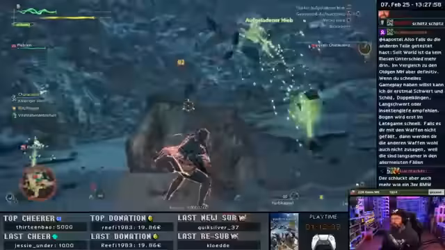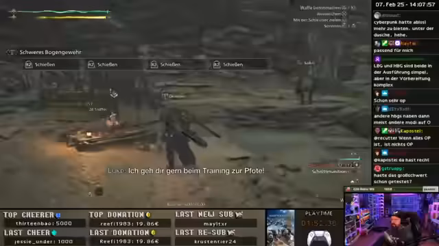 01:48:56Die leichte Bogen-Waffe wird als extrem stark empfunden und bietet eine Vielfalt an Munitionstypen. Es gibt Munition, die das lähmt, friert oder Teile abschneidet. Der Streamer hebt hervor, dass man in einer Gruppe gezielt Monster in bestimmte Zustände bringen kann. Der strategische Aspekt des ständigen Munitionswechsels und der Agilität der Waffe wird als "krass" beschrieben. Besonders der Fokus-Modus, der verbrauchte Munition einsetzt, um den Schaden zu erhöhen, wird als "übertrieben geil" gelobt. Die Waffe wird trotz ihrer Stärke als etwas nervig eingestuft, da man sich ständig um Munition kümmern muss.