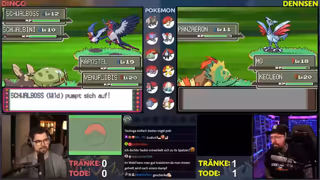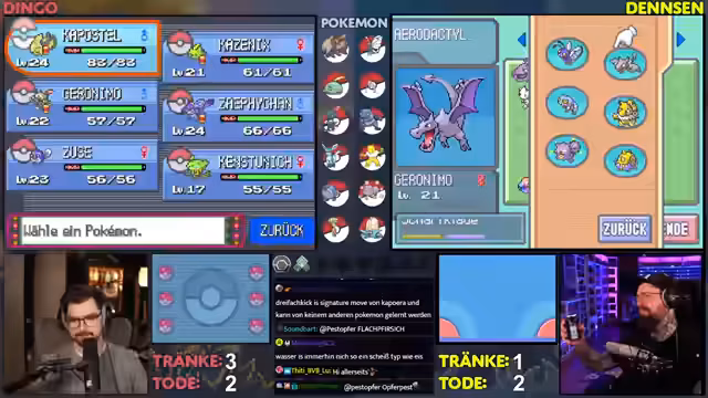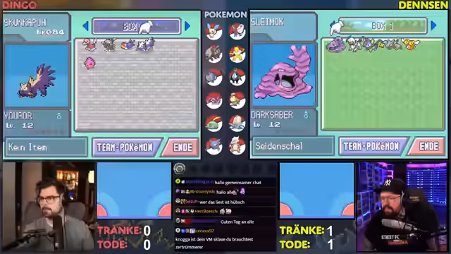 01:23:54Die Zusammenarbeit in Pokémon Soullink verläuft reibungslos. Beide Streamer tauschen sich über ihre Pokémon aus, die sie in einem Nuzlocke-Modus gesammelt haben. Sie stellen fest, dass ihre Teams leicht voneinander abweichen, was zu einem kurzen Austausch über die eingesetzten Pokémon wie Darksaber, Kapostel und Zuse führt. Ihr Ziel ist es, gemeinsam voranzukommen und ihre Teams zu stärken, während sie sich durch die Handlung kämpfen.