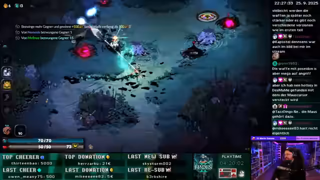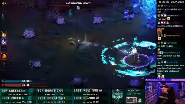 00:47:58Nach Ankündigung, dass Hades 2 um 18 Uhr erscheinen wird, beginnt der Streamer ein erstes Gameplay. Er spielt einen Run mit dem Charakter 'Amok', dessen Fähigkeit darin besteht, Gegner zu vergiften, die beim Tod explodieren und nahe Feinde ebenfalls vergiften. Der Fokus liegt auf der Suche nach Items, die das Gift verstärken, insbesondere dem Käse und einem Magneten für zusätzliche Projektile. Der Run endet, da der Streamer den Boss zu spät erreicht und von Gegnern überrannt wird.