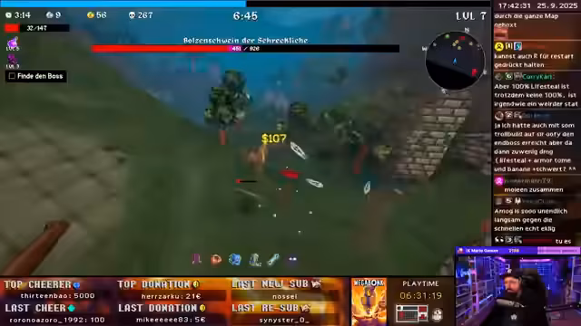 01:55:57Der Streamer beginnt den Spielmodus "Instant" und stürzt sofort in einen lauten, unruhigen Kampf. Er beschreibt den Build als "greedy" und die Items nicht ideal, besonders ein "Mengenband", das ihm wenig nützt. Das Gameplay wird als fordernd und chaotisch wahrgenommen, da er oft stirbt und Schwierigkeiten hat, Synergien zwischen seinen Ausrüstungsgegenständen zu finden. Er erinnert sich an das Ziel, möglichst viele Gegner zu töten und auf das Highscore-Board zu klettern. Die Suche nach einem guten Boss und besseren Items gestaltet sich frustrierend.