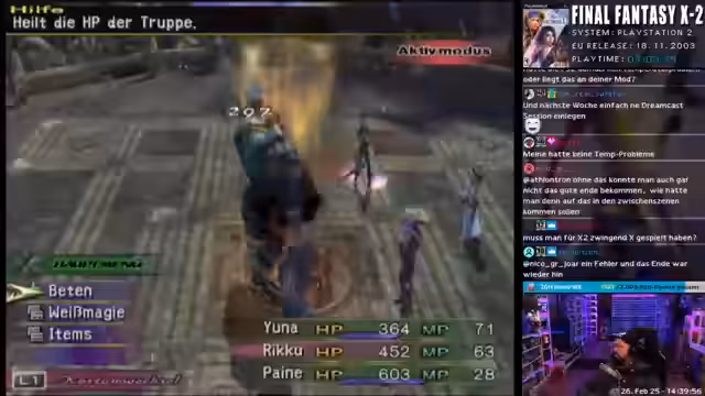 00:41:28Der Streamer erkundet das Kampfsystem von Final Fantasy X-2 und findet es bisher sehr schnell und ansprechend. Er experimentiert mit verschiedenen Kostümen und Fähigkeiten, wie Angriff, Schwert Tag und Kraftbrecher. Er bemerkt, dass das ATB-System (Active Time Battle) scheinbar vorhanden ist und dass er Aktionen ausführen kann, wenn der grüne Balken voll ist. Er versucht, von Gegnern zu stehlen und entdeckt verschiedene Items. Er stellt fest, dass Yuna im gegnerischen Team ist und klaut eine Eye-Potion. Der Streamer probiert verschiedene Moves aus und stellt fest, dass er mit R1 etwas machen muss, um einen Eisenreif zu klauen. Er bemerkt, dass er null Schaden verursacht, aber das Kampfsystem trotzdem cool findet, weil es so schnell ist. Er wechselt Kostüme mit L1 und probiert die Diva und den Schützen aus. Er lernt neue Fähigkeiten wie Gilklau und Flammenschwert. Er entdeckt, dass die Kostüme eigene HP-Werte haben und dass es sich um ein klassisches Jobsystem handelt.