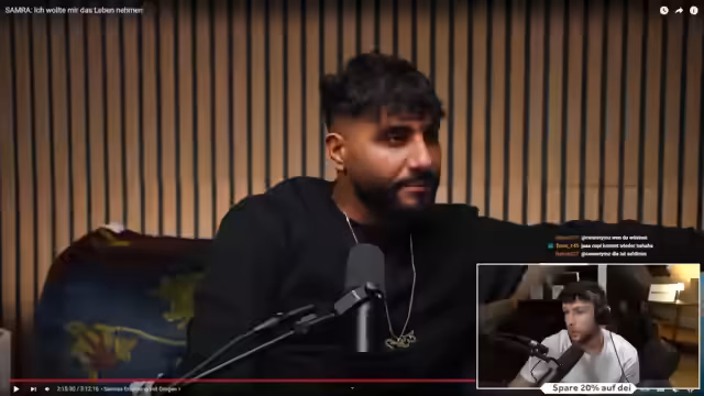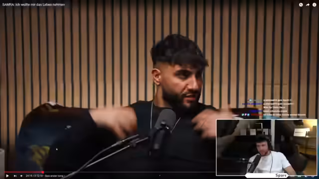 01:11:44Der Stream geht in die Details von Samras Kindheit. Geboren in Berlin-Lichtenfelde, musste er seine ersten Lebensmonate im Brutkasten verbringen, was seine Mutter belastete. Als Fünftes von sechs Kindern einer Arbeiterfamilie suchte er früh nach Anerkennung und Liebe. Mit zwölf Jahren begann er zu rappen und fand in diesem Medium den Weg, Aufmerksamkeit zu bekommen. Sein erstes prägendes Erlebnis war die Begegnung mit dem älteren Rapper Seifu, der ihn zum ersten Mal ins Studio nahm und ihm auf diesem Weg den nötigen Selbstbewusstsein gab.