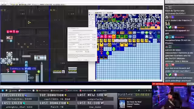 01:14:32Nachdem der Hintergrund 'Industrial' (BG1) importiert wurde, geht es an die Anpassung der Farbpalette. Der Streamer stellt fest, dass die aktuelle Palette zu hell ist und der sich nicht ausreichend vom Hintergrund abhebt. Auf Anregung im Chat macht er die Palette deutlich dunkler, indem er das Violette entfernt und alles in ein dunkleres Grau-Farbton umwandelt. Die Anpassung sorgt für den gewünschten Kontrast. Nach erfolgreicher Anpassung und mehreren Versuchen, die Grafikplatte korrekt zu importieren, speichert der Streamer den Stand des Ninji-Levels unter dem Namen 'Ninja 004'.