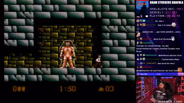 03:08:31Der Streamer beginnt mit dem NES-Spiel 'Bram Stokers Dracula' und testet die Unterschiede zwischen den Schwierigkeitsgraden 'Easy' und 'Hard'. Er stellt fest, dass der erhöhte Schwierigkeitsgrad nicht mehr Schaden verursacht, sondern die Anzahl der Gegner und die Lebenspunkte der Bosse erhöht. Im Gegensatz dazu hat der Spieler auf 'Hard' weniger Ressourcen wie Waffen-Upgrades. Trotz einiger unfares wirkender Momente, wie der schwer erkennbaren Schubserhand, gelingt es dem Streamer, das Spiel relativ schnell zu beenden. Er bewertet das Spiel als 'kleines süßes Game', dessen Schwierigkeitsgrad wählbar ist, was ihm als gute Lösung erscheint.