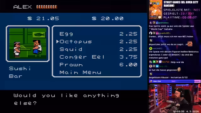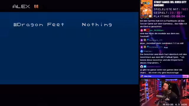04:09:14Das dritte vorgestellte Spiel ist 'Street Gangs' (US: 'River City Ransom'). Der Streamer ist sofort von dem Spiel begeistert und bezeichnet es als 'Hammer-Game'. Besonders positiv hervorgehoben werden die modern anmutende Grafik, das gut funktionierende Steuerungssystem mit Dash- und Sprungfunktionen sowie das tiefe RPG-Element, bei dem man Charakter-Stats durch den Kauf von Food und Items permanent verbessern kann. Auch die Zwei-Spieler-Funktion wird als 'absolute Freude' gelobt. Obwohl er beim Bosskampf auf Hindernisse stößt und das Spiel grinden muss, um stark genug zu werden, bleibt er sehr angetan. Das Voting der Community bestätigt den positiven Eindruck mit einer hohen Wertung von 8,2.
