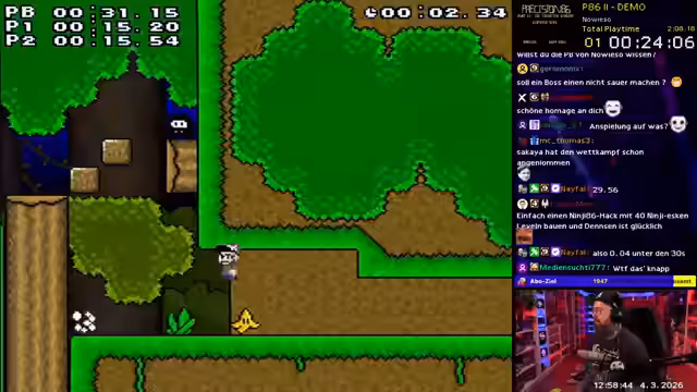 00:40:17Nachdem der Bosskampf abgeschlossen ist, gelangt der Streamer in ein spezielles Ninja-Level innerhalb der P86-Demo. Dies ist ein Zusatzlevel, das von einem Entwickler namens Noviso erstellt wurde, und als Belohnung muss es in unter 30 Sekunden absolviert werden. Er beginnt sofort und versucht, die bestmögliche Zeit zu erzielen. Er findet heraus, dass ein Sprung, der nur im ersten Frame gelingt, für eine schnelle Zeit entscheidend ist. Nach mehreren Versuchen schafft er es, den Abschnitt zu meistern und ist begeistert von der eingebauten Herausforderung und dem Design des Levels.