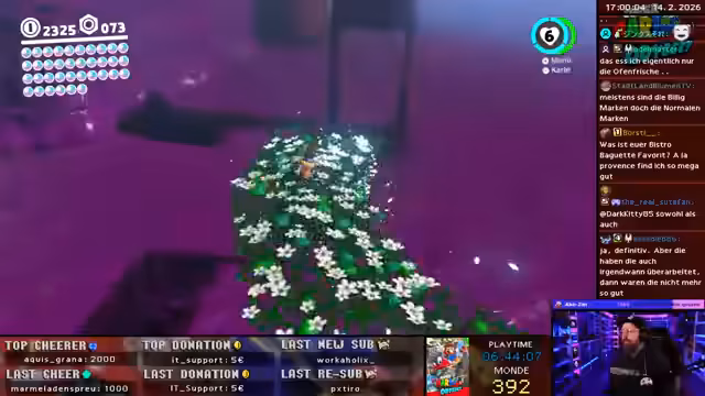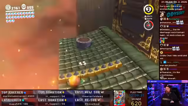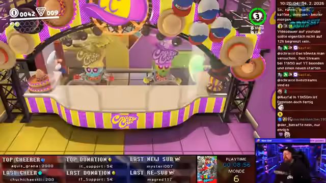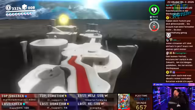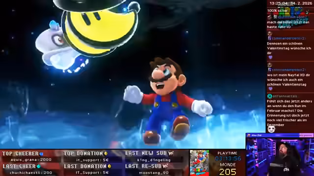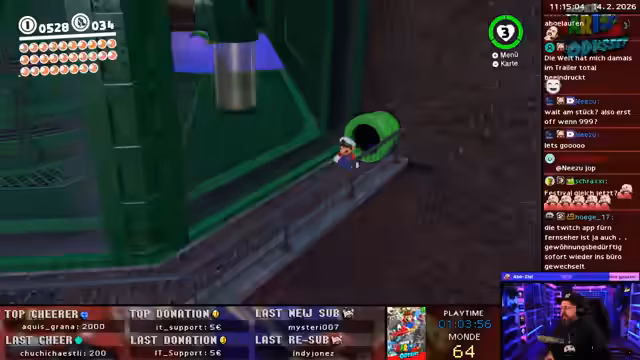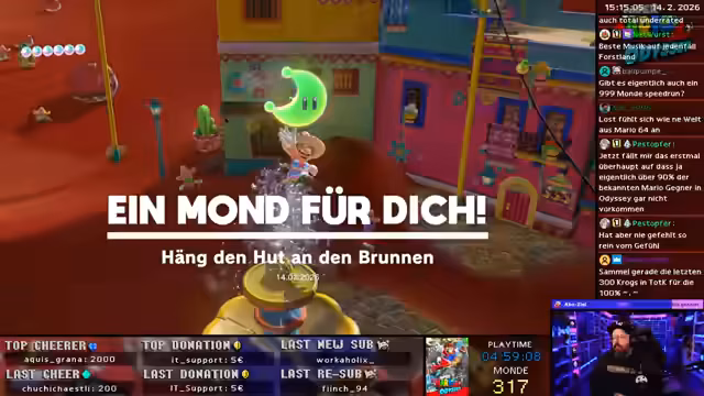 08:30:08Der Streamer spielt Mario Odyssey und hat das Ziel, alle 999 Monde zu sammeln. Er befindet sich auf der Suche nach den letzten Monden in verschiedenen Welten, wie Lost in der Tiefsee und der Hotel Bonanza Welt. Der Prozess wird als lang und manchmal frustrierend beschrieben, besonders bei nervigen Aufgaben wie dem Quiz in Schlemmerland. Trotzdem macht er weiter und ist mit dem Tempo und der Konsequenz des Runs zufrieden, vergleicht sich aber nicht mit dem Weltrekord.