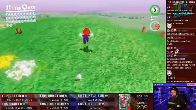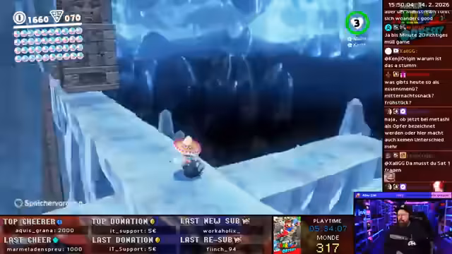 03:35:28Der Streamer setzt seine Münzensammlung fort, wobei er im Hinterkopf hat, dass die Counter im Spiel bei jedem Verlassen der Welt zurückgesetzt werden. Er stellt fest, dass er im Vergleich zu vor sechs Wochen viel mehr im Kopf hat, wo die Monde und Münzen versteckt sind. Eine Herausforderung stellt der sogenannte 'Schafsmond' dar, den er als einen der schlimmsten Monde im gesamten Spiel bezeichnet und den er erst am Ende holen möchte.