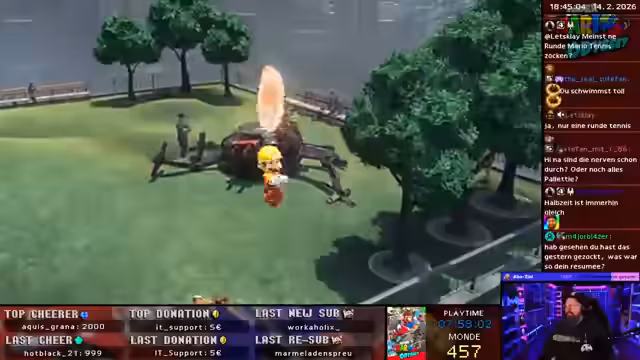 07:55:41Nach der Ankunft einer Pizza und dem Erreichen eines der schwierigsten Welten in Mario Odyssey, entscheidet sich der Streamer für einen entspannenden Abstecher in die Vergangenheit. Er schaltet die Retro-Sendung 'Games World' ein, um eine Folge mit den Kandidaten Tim, Mateo, Andreas, Kerstin und Andrea zu verfolgen. Er kommentiert die skurrilen und für ihn oft ärgerlichen Herausforderungen der Kinder mit viel Humor und Nostalgie, insbesondere während eines Spiels namens 'Wind Jammers'.