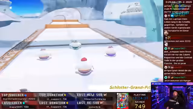 08:43:31Der Streamer diskutiert über verschiedene Gaming-Themen. Er kritisiert die Langsamkeit des Mond-Quiz in Schlemmerland, äußert seine Abneigung gegen das Polarland und die Blue Coins. Weiterhin erwähnt er den Community-Train auf Twitch, der durch Subs Emotes für den Chat freischaltet, und die damit verbundenen Hilferufe von Chattern wie Marmeladenspreu. Auch das Spiel Revolt wird als geiler als Mario Kart in der damaligen Zeit bezeichnet.