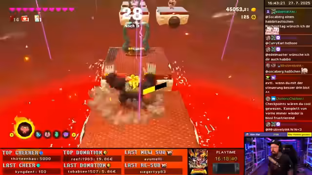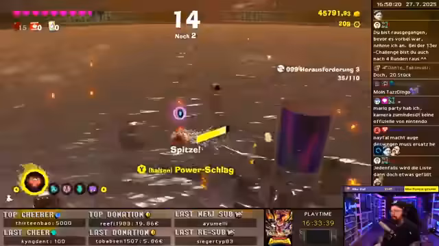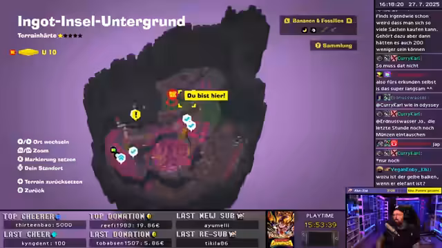 05:07:55Der Streamer startet mit den Donkey Kong Bananza Challenges. Nach anfänglichen Schwierigkeiten beim Sammeln der Bananen und dem Verständnis der Spielmechanik, insbesondere der Surfen-Funktion, wird der Fokus auf das 100% Sammeln rasch frustrierend. Das ständige Neumachen von Challenges führt zu großer Verärgerung und dem Gefühl des "Salz-Seins", da der Timer weiterläuft und das Spiel als "todesöde" und "nicht spaßig" beschrieben wird.