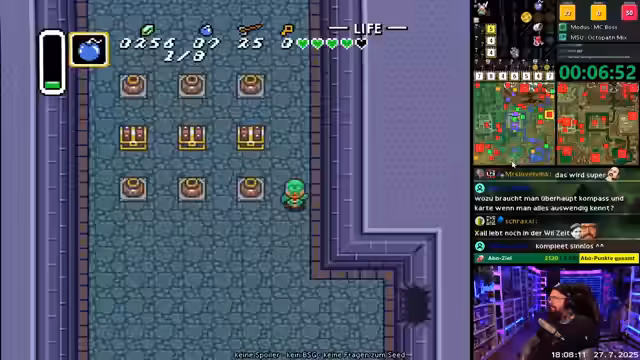 05:59:25Nach einer kurzen Pause mit Getränkeholen startet der Streamer in den Teil "Zelda ALTTPR Weekly". Mit großer Spannung bittet er um einen Seed und ein Sprite für den Racer. Die Musik und der Modus "Map, Kompass und Boss Shuffle" begeistern ihn sofort, da er eine willkommene Abwechslung und einen geilen Spielmodus sieht, den er so noch nie ausprobiert hat.