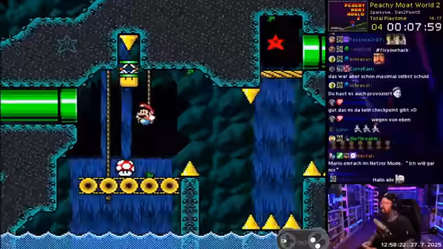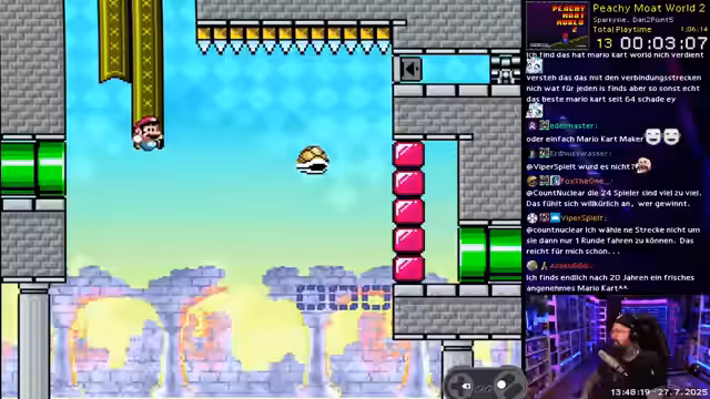 00:00:00Der Stream beginnt mit der Auswahl eines SMW-Hacks namens PG Mode World, ein Experten-Hack mit 44 Exits. Streamer ist begeistert vom modernen Look und der hohen Qualität des Hacks und startet direkt ins Gameplay. Er bewegt sich durch die erste Welt, sammelt Orbs und bewundert das ansprechende Level-Design, das sich wie ein eigenständiges Spiel anfühlt. Die Motivation ist hoch, und er zeigt sich positiv überrascht von den kreativen Challenges.