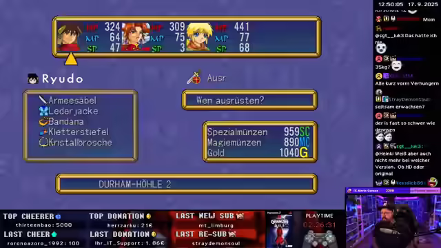 02:49:04Die Duramhöhle wird betreten und ein Eichhörnchen-Fuchs-Nagetier namens Karo entdeckt, das Pflaumennüsse sammelt. Millenia setzt ihren Pfeilschuss ein. Es wird festgestellt, dass es keine Random Encounters gibt. Eine Falle wird entdeckt. Es wird überlegt, ob Feuerzauber eingesetzt werden soll. Eine Pflaumennuss wird gefunden, die Karo gegeben wird. Rowan wird gefunden und gerettet. Millenia beschließt, Rowan mitzunehmen, obwohl Ryudo dagegen ist. Rowans Charakter wird vorgestellt: 13 Jahre alt, sucht verlorenen Schatz, wohlerzogen, optimistisch. Rowan erhält ein heiliges Ei. Ryudo levelt die Magie und Fertigkeiten auf. Es wird eine Beruhigende Harfe gefunden. Der Goldhammer wird getestet. Ein Schieberätsel muss gelöst werden. Ein Steinkopf und ein Bandana werden gefunden. Es wird überlegt, ob geheilt werden soll. Stormsen schenkt ein Sub-Geschenk. Es wird festgestellt, dass die Gegner sehr viel aushalten. Ein Bosskampf beginnt.