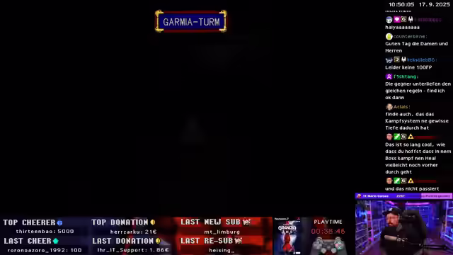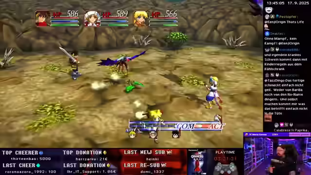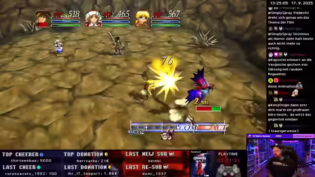 00:40:29Der Streamer beginnt die ersten Kämpfe und erklärt das Kampfsystem, das er noch aus dem ersten Teil kennt. Die Aktionsleiste unten zeigt den Zeitpunkt, wann ein Command ausgewählt werden kann. Es gibt kritische Hiebe, die den Gegner auf dem Aktionsbalken nach hinten werfen oder Aktionen abbrechen können, sowie Kombo-Angriffe, die mehr Schaden verursachen. Skills leveln, indem man sie benutzt. Der Streamer probiert den Ten Saiken Heap aus. Es wird erklärt, dass der Gegner seinen Command machen darf, aber auch Zeit braucht. Der Begriff "Abbrechen" wird als dumme Übersetzung kritisiert. Es wird festgestellt, dass "Cancel" bedeutet, dass der Schlag des Gegners abgebrochen wurde. Die Kombo kommt schneller und verursacht einen Konter, wenn sie ausgeführt wird, während der Gegner seine Aktion ausführt. Die Übersetzung wird als schlimm empfunden, da "Damage" als "Beschädigung" übersetzt wird.