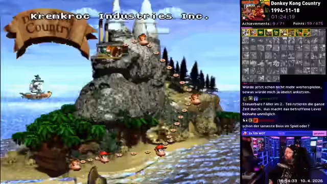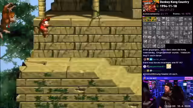 02:52:00Nach mehreren Versuchen und dem Testen verschiedener Einstellungen bleibt das Problem mit den Achievements ungelöst. Der Streamer ist zunehmend frustriert und zieht eine negative Bewertung des gesamten Erlebnisses. Die Technik hat seinen Spielspaß, auch für ein eigentlich gutes Spiel wie Donkey Kong Country, vollständig zerstört. Er überlegt, das Spiel nicht zu beenden, die Achievements aus seinem Profil zu löschen und stattdessen einen Emulator zu nutzen, um den Technikkram loszuwerden.