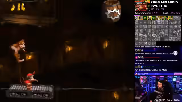 03:16:56Der Stream gibt Donkey Country endgültig auf. Das Spiel wird dabei nicht negativ wegen des Gameplays bewertet, sondern ausschließlich aufgrund der technischen Pannen. Er erkennt "Peak-Level-Design" und eine "geile Grafik" an, macht aber das Retro Achievements-System für seine mangelnde Freude verantwortlich. Der Spielspaß sei dahin, da er das Spiel nur noch aus Frust durchrenne und nichts mehr sammle, weil es nichts bringe. Das Stream-Erlebnis wurde für ihn zum Killer.