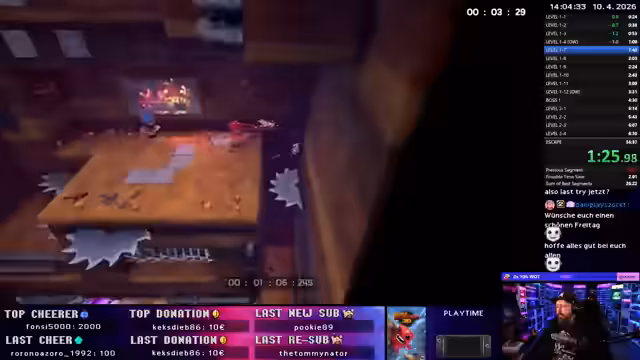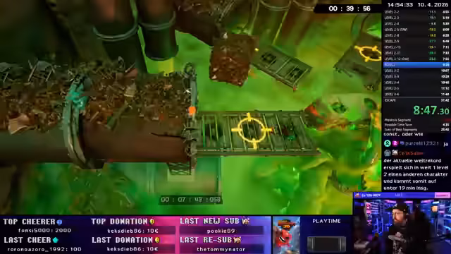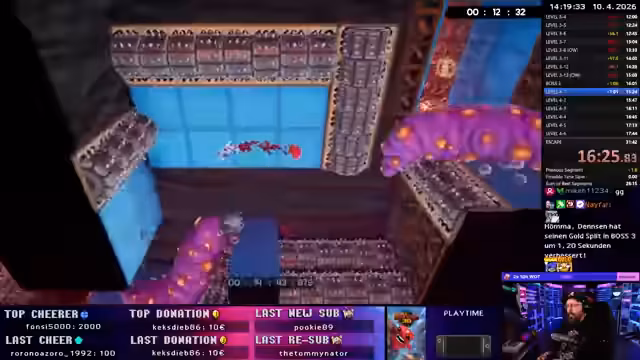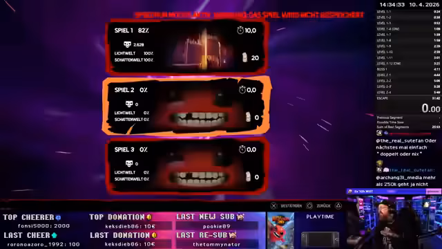 00:10:03Die ersten Minuten des Streams widmen sich dem Spiel Super Meat Boy 3D. Der Streamer findet den Modus zwar "geil", kritisiert aber stark das Level-Design. Die fehlende Klarheit der Ebenen und die perspektivische Darstellung führen dazu, dass der Charakter versehentlich in tödliche Fallen läuft, obwohl dies optisch nicht erkennbar ist. Bosskämpfe werden als "Runkiller", "langweilig" und "zu bestrafend" bezeichnet und der Streamer äußert die Absicht, diese erst am Wochenende anzugehen, um "dicken Timeloss" zu vermeiden.
