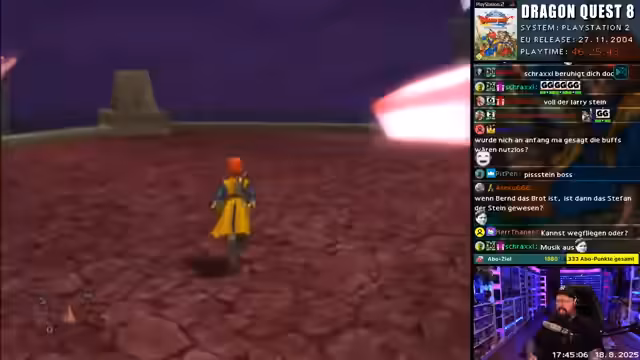 00:45:21Der Streamer lädt den Savegame für den finalen Dungeon von Dragon Quest 8. Er befürchtet, den falschen Stand zu geladen, stellt aber fest, dass alles korrekt ist. Im Dungeon angekommen, stößt er auf starke Gegner mit sehr viel Lebenspunkten. Die Kämpfe werden als extrem langweilig und frustrierend beschrieben, da sie viel Zeit in Anspruch nehmen und kaum Fortschritt im Levelaufbau bringt. Die Jagd nach seltenen Items wird als mühsam empfunden.