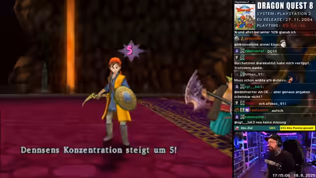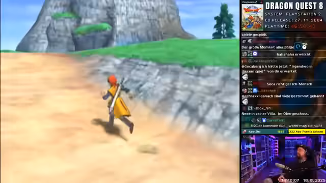 00:03:21Der Stream beginnt mit technischen und spielerischen Schwierigkeiten. Der Streamer diskutiert mit dem Chat über einen scheinbar unmöglichen Quadratzahl-Code, wobei er von seiner Katze abgelenkt wird. Beim Spielen von Dragon Quest 8 berührt er Stacheln und stirbt, obwohl ein Passiv-Auto-Revive-System aktiv ist. Gleichzeitig treten Probleme mit der Steuerung auf, insbesondere mit den Farben der Joy-Con, die sich unerklärlich verhalten.