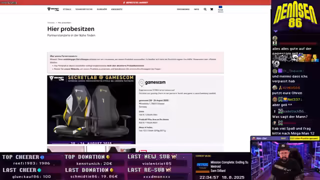 07:48:54Zum Schluss des Streams gibt der Streamer wichtige Informationen für seine Community. Er kündigt seine Abwesenheit bis Montag an und teilt mit, wo er während der Gamescom zu sehen sein wird, unter anderem auf den Streams von Capcom und Rocket Beans. Zudem wirbt er für sein eigenes Möbelunternehmen 'HolyEMPSecretlab' und lädt seine Fans auf der Messe zum Probesitzen seiner Produkte ein.