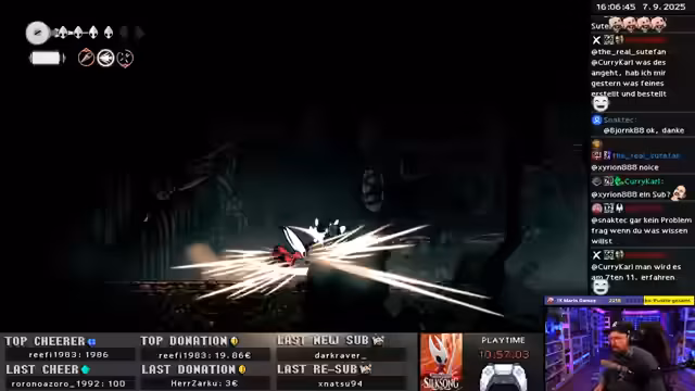 08:08:38Der Streamer resümiert die Session als 'insane' und ein 'Fest', besonders aufgrund der 'geilen Challenges' und 'geilen Bosse'. Er zeigt sich begeistert vom Spiel und der Zuschauerreaktion, auch wenn viele selbst spielen und keine Spoiler sehen wollen. Für den nächsten Tag sind Mario Party und ein Zelda-Race geplant, während Dienstag und der folgende Sonntag komplett Hollow Knight gewidmet sein sollen.
